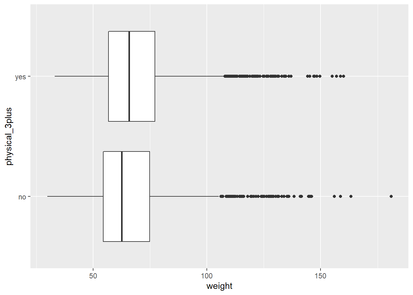 We make a boxplot of physical_3plus vs. weight. Is there a relationship between these two variables?